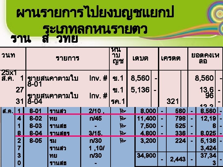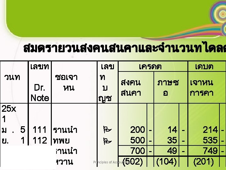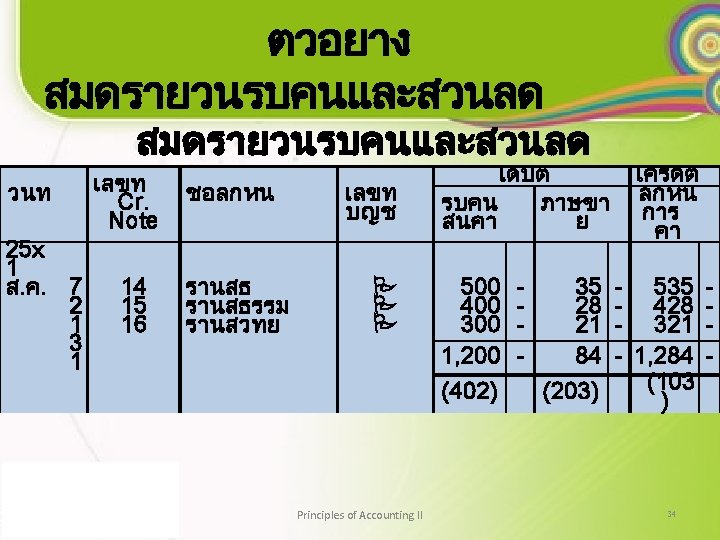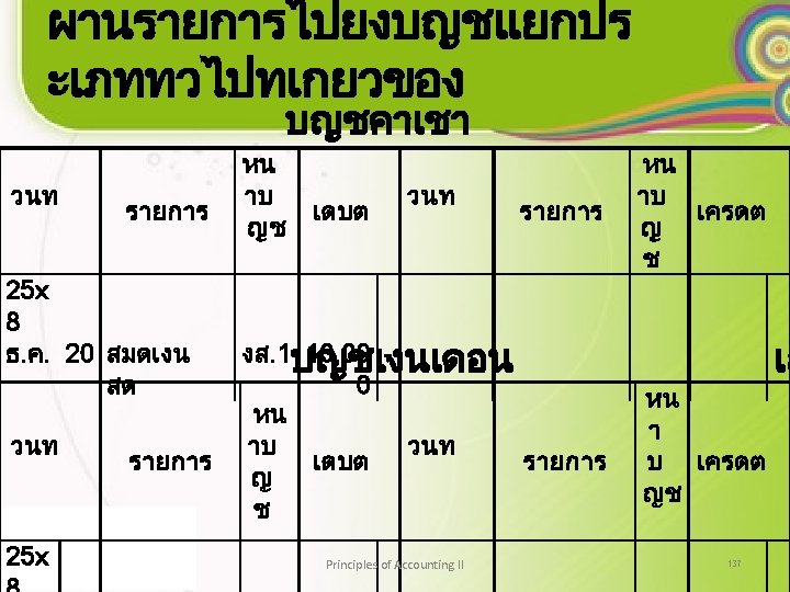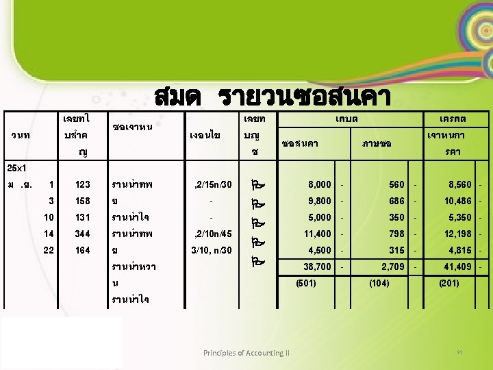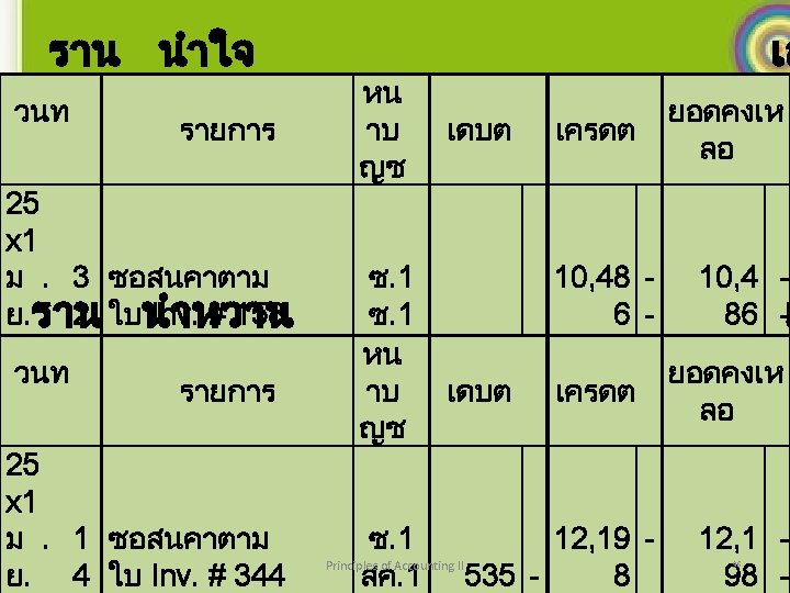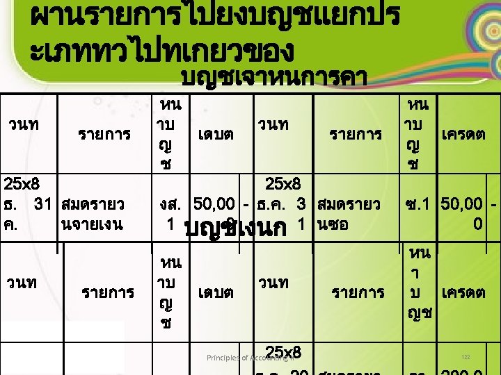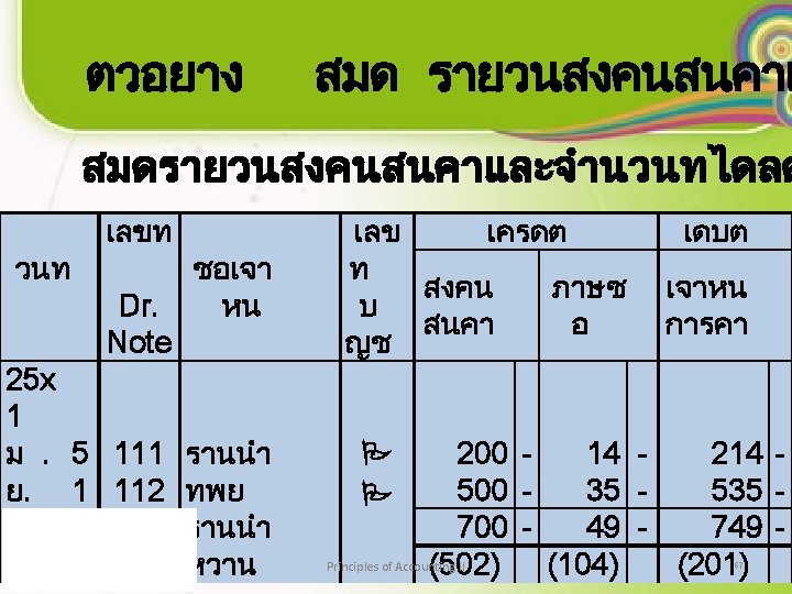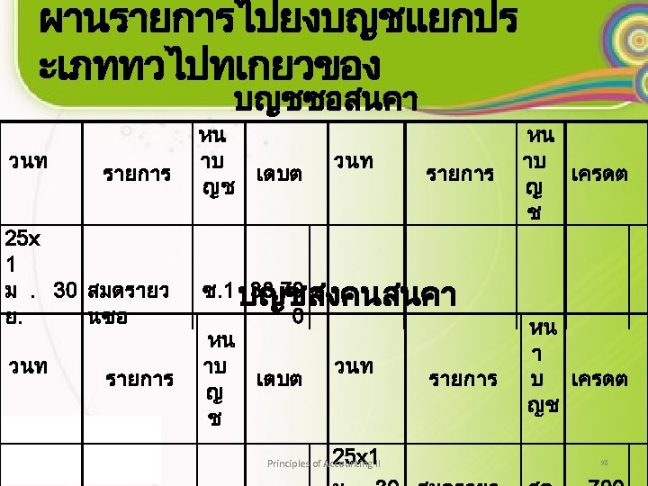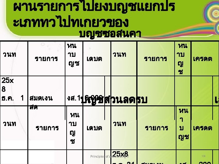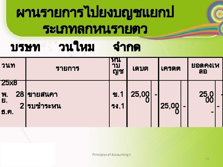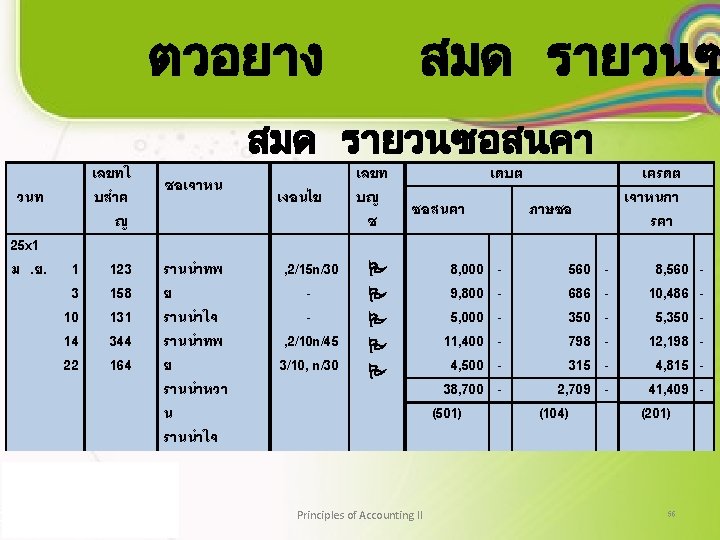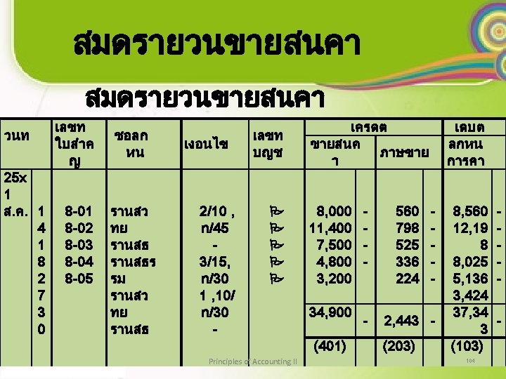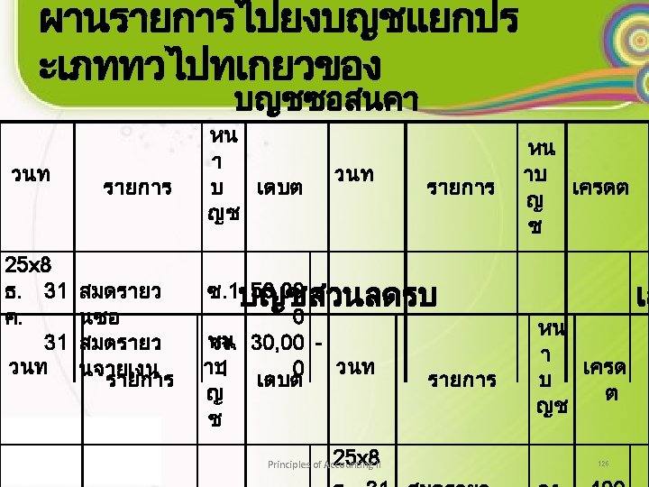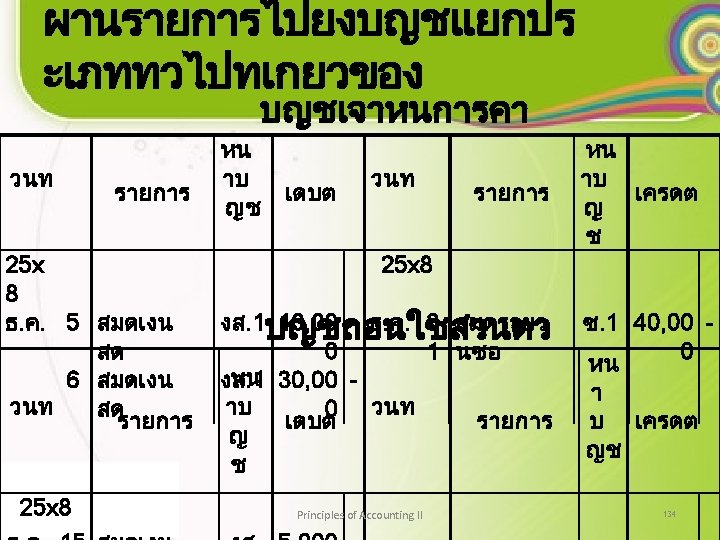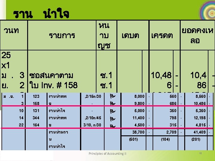 ผานรายการไปบญชแยกปร ะเภททวไป ลกหนการคา Date Description 25 x 1 ส. ค. 31 สมดรายวนข าย ส. ค. 1 4 1 8 2 7 3 0 8 -01 8 -02 8 -03 8 -04 8 -05 รานสว ทย รานสธร รม รานสว ทย รานสธ Page No. Dr. Date Description amount ข. 1 37, 343 - 2/10 , 8, 000 n/45 11, 400 7, 500 3/15, 4, 800 n/30 3, 200 1 , 10/ n/30 34, 900 Principles of Accounting II - Page No. 560 798 525 336 224 - 2, 443 - Cr. amount 8, 560 12, 19 8 8, 025 5, 136 3, 424 37, 34 29 3 -