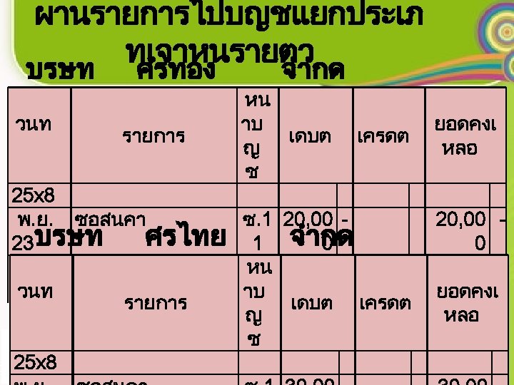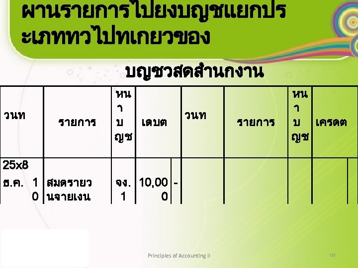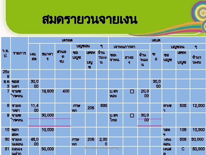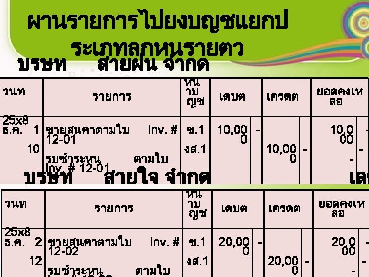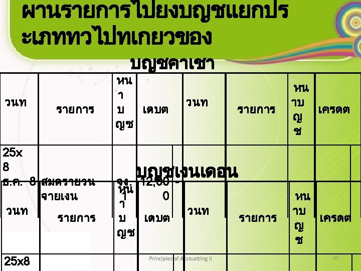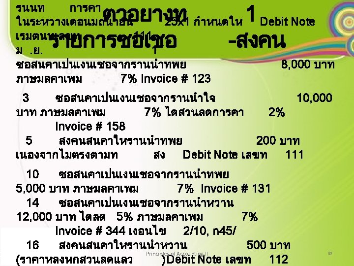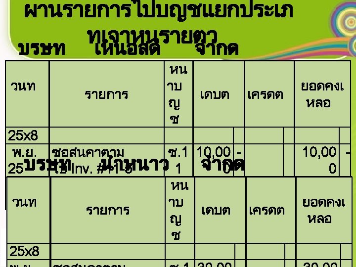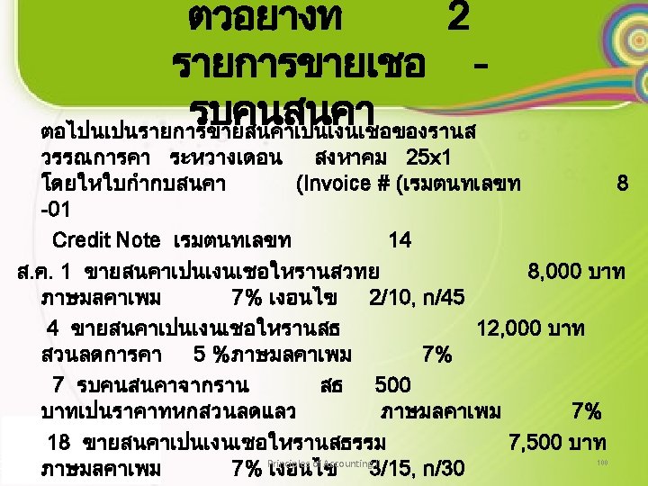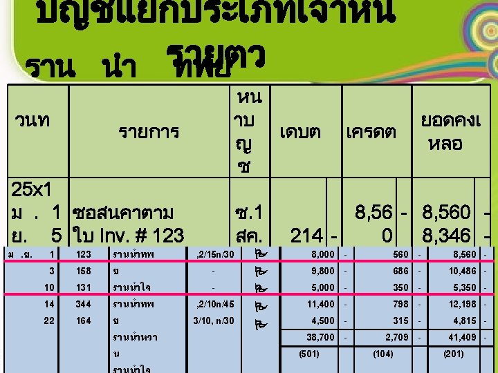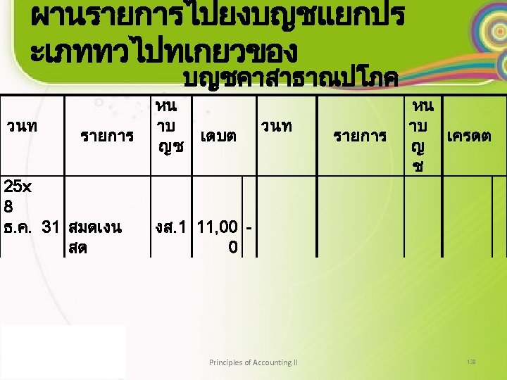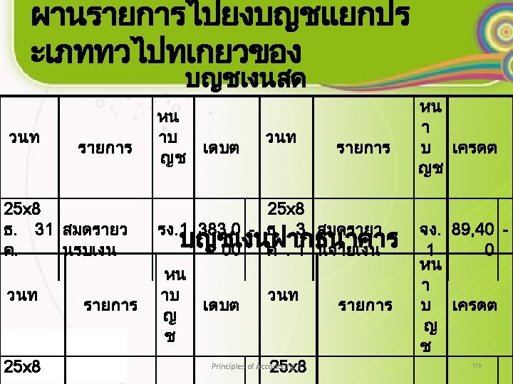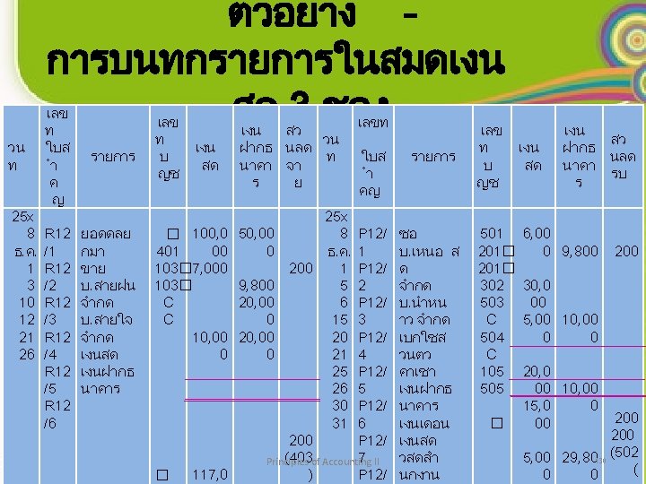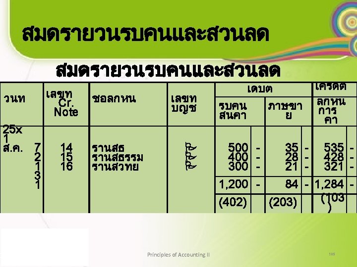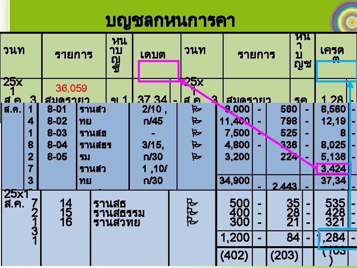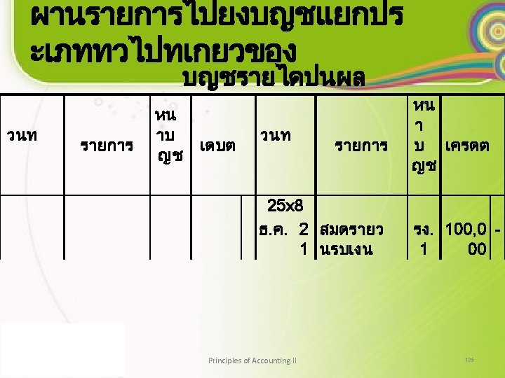 ผานรายการไปบญชแยกปร ะเภททวไป ลกหนการคา Date Description 25 x 1 ส. ค. 31 สมดรายวนข าย ส. ค. 1 4 1 8 2 7 3 0 8 -01 8 -02 8 -03 8 -04 8 -05 รานสว ทย รานสธร รม รานสว ทย รานสธ Page No. Dr. Date Description amount ข. 1 37, 343 - 2/10 , 8, 000 n/45 11, 400 7, 500 3/15, 4, 800 n/30 3, 200 1 , 10/ n/30 34, 900 Principles of Accounting II - Page No. 560 798 525 336 224 - 2, 443 - Cr. amount 8, 560 12, 19 8 8, 025 5, 136 3, 424 37, 34 29 3 -