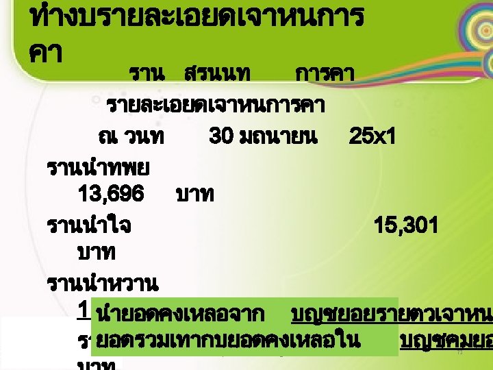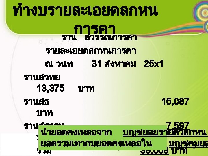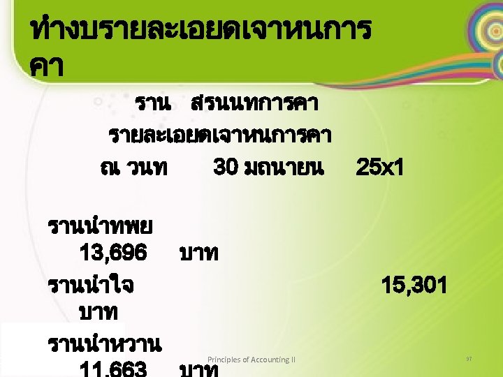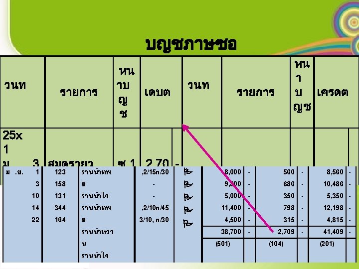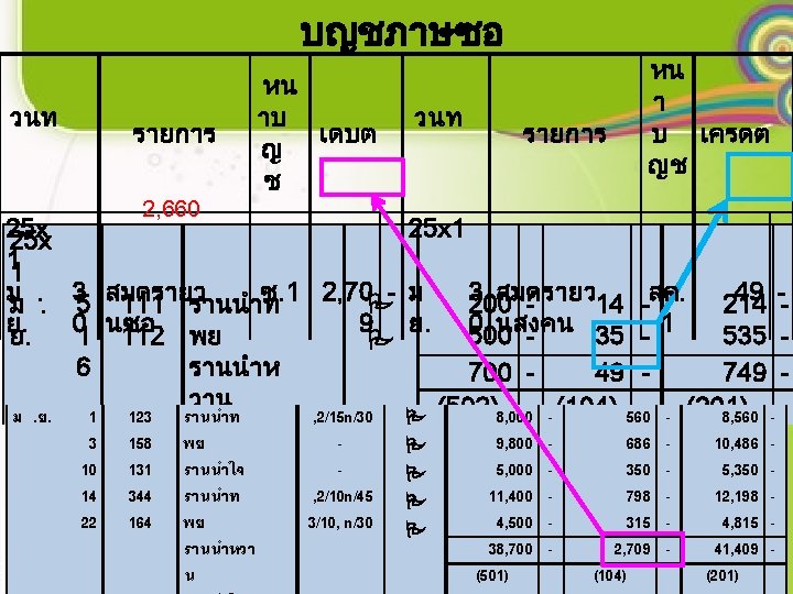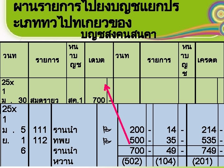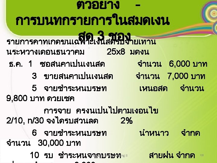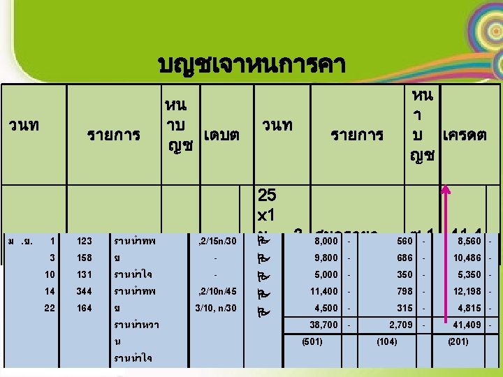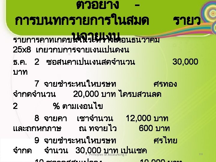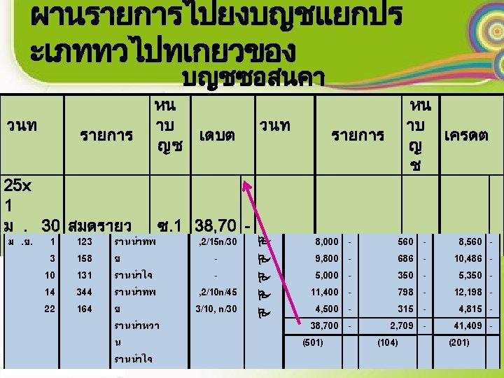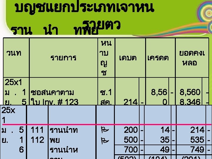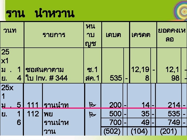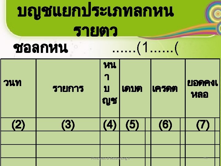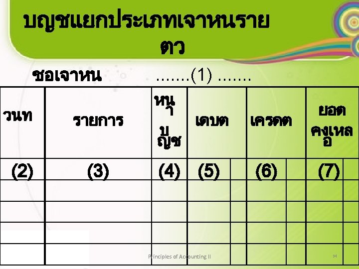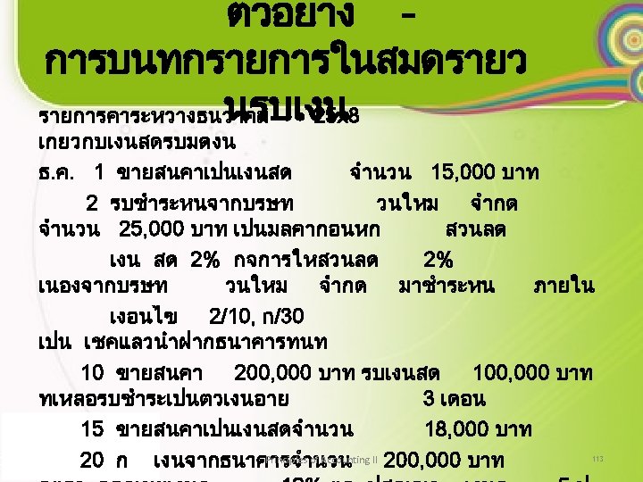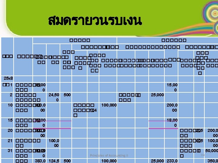ผานรายการไปบญชแยกปร ะเภททวไป ลกหนการคา Date Description 25 x 1 ส. ค. 31 สมดรายวนข าย ส. ค. 1 4 1 8 2 7 3 0 8 -01 8 -02 8 -03 8 -04 8 -05 รานสว ทย รานสธร รม รานสว ทย รานสธ Page No. Dr. Date Description amount ข. 1 37, 343 - 2/10 , 8, 000 n/45 11, 400 7, 500 3/15, 4, 800 n/30 3, 200 1 , 10/ n/30 34, 900 Principles of Accounting II - Page No. 560 798 525 336 224 - 2, 443 - Cr. amount 8, 560 12, 19 8 8, 025 5, 136 3, 424 37, 34 29 3 -