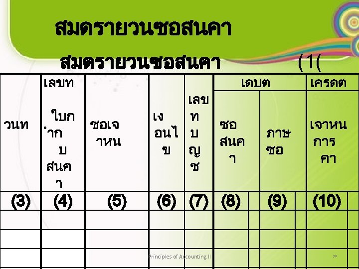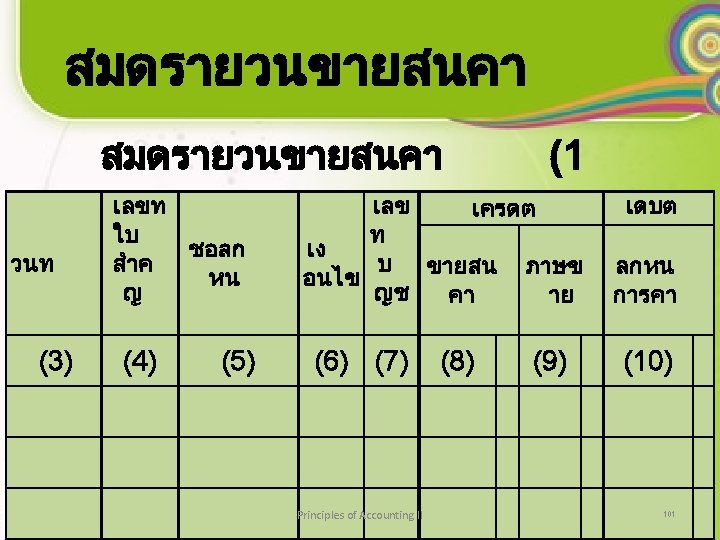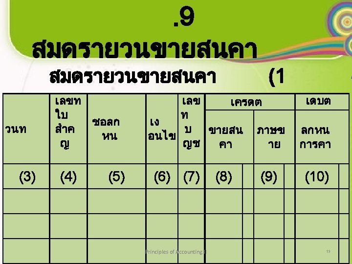 9. Sales Journal Recognition entry; Sale on account การบนทกบญช ขายสนคาเปนเงนเชอ Dr. ลกหนการคา (103) xx Cr. ขายสนคา (401) xx Principles of Accounting II 17