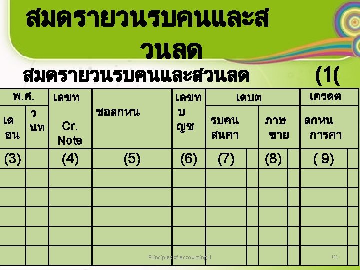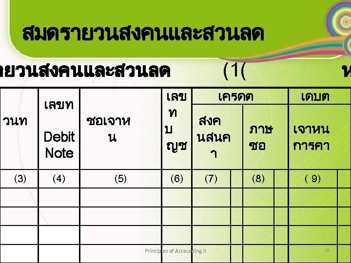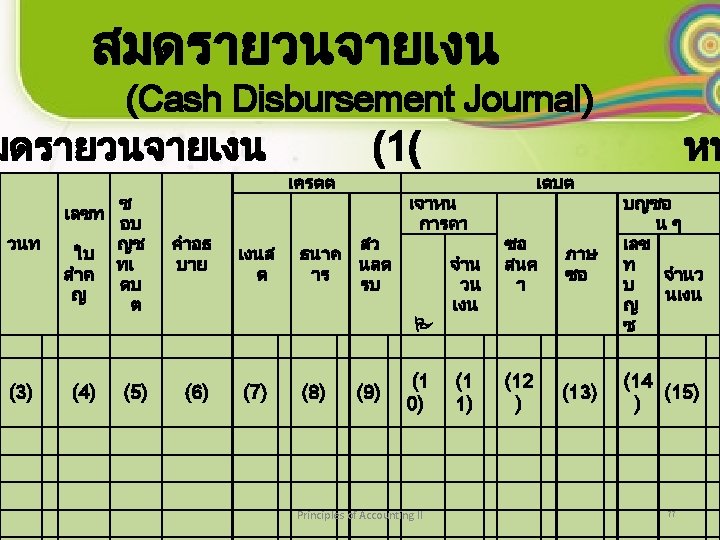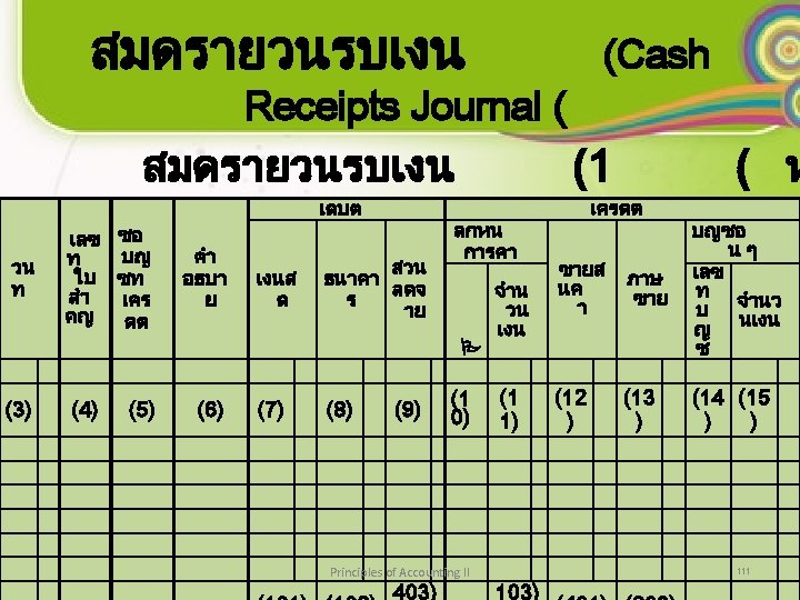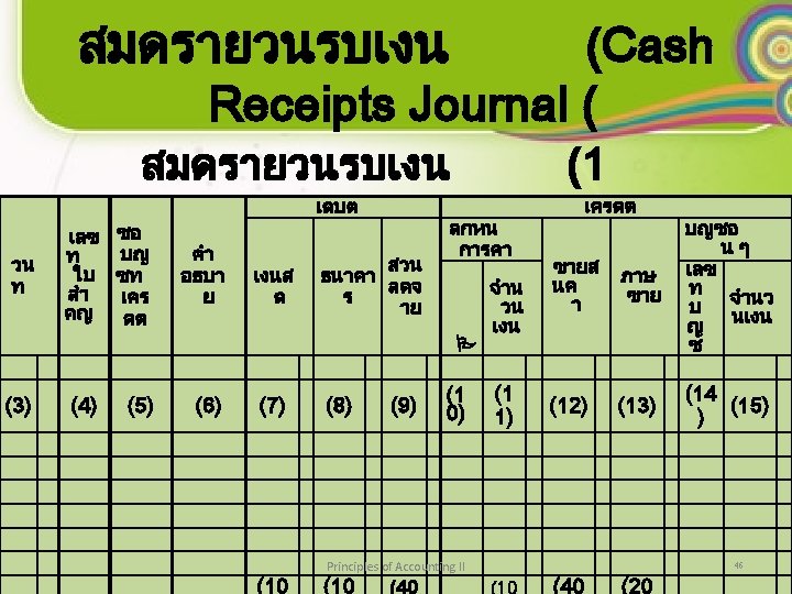 8. Type of Special Journals • Sales Journal (สมดรายวนขาย ) • Sales Return Journal (สมดรายวนรบคน ) • Cash Receipt Journal (สมดรายวนรบเงน ) • Purchases Journal (สมดรายวนซอ • Purchases Return Journal (สมดรายวนสงคน ) Principles of Accounting II ) 14