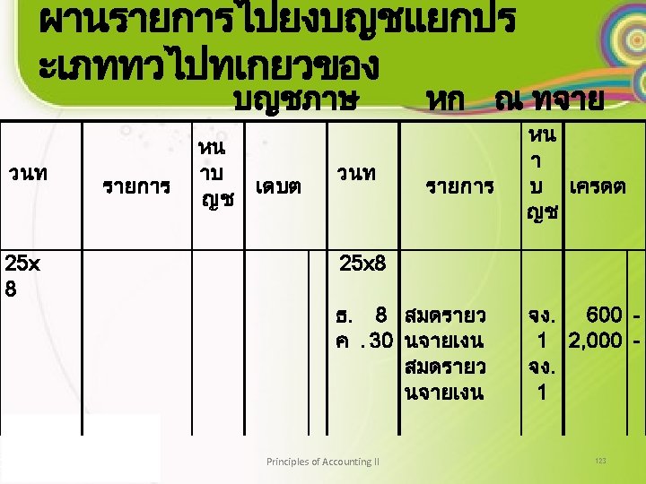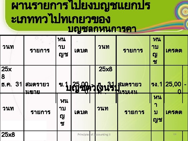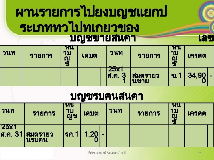 ผานรายการไปบญชแยกปร ะเภททวไป ขายสนคา Date Description Page No. Dr. Date Description amount 25 x 1 ส. ค. 31 สมดรายวน ขาย ส. ค. 1 4 1 8 2 7 3 8 -01 8 -02 8 -03 8 -04 8 -05 รานสว ทย รานสธร รม รานสว ทย 2/10 , 8, 000 n/45 11, 400 7, 500 3/15, 4, 800 n/30 3, 200 1 , 10/ n/30 Principles of Accounting II 34, 900 - Page No. Cr. amount ข. 1 34, 900 - 560 798 525 336 224 - 2, 443 - 8, 560 12, 19 8 8, 025 5, 136 3, 424 27 37, 34 -