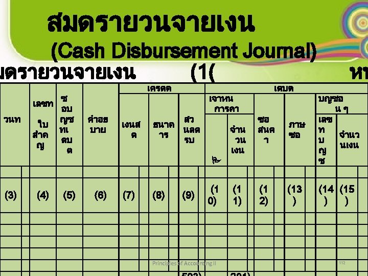 15. Cash Disbursement Journal )1 Date (3) Voucher No. (4) Account Name Description Dr. (5) (6) Cr. Cash Bank Accounts Payable Purchases Discount (7) (8) (9) (101) (102) (503) amount Page (2) ( Dr. Purchases VAT (10) (11) (12) (13) (201) (501) (104) Principles of Accounting II Other Accounts AC. No. amount (14) (15) 76