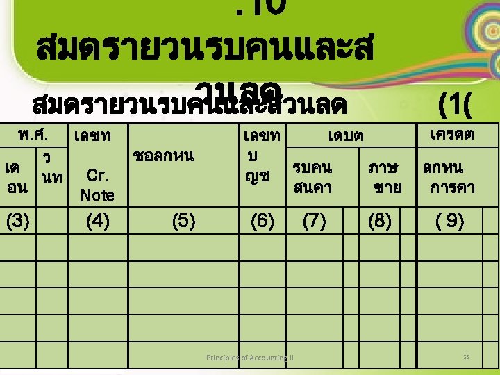 10. Sales Return Journal • When, Sales Returns on account • การบนทกบญช รบคนสนคาจากการขายเช อ Dr. รบคนสนคา (402) xx Principles of Accounting II 31