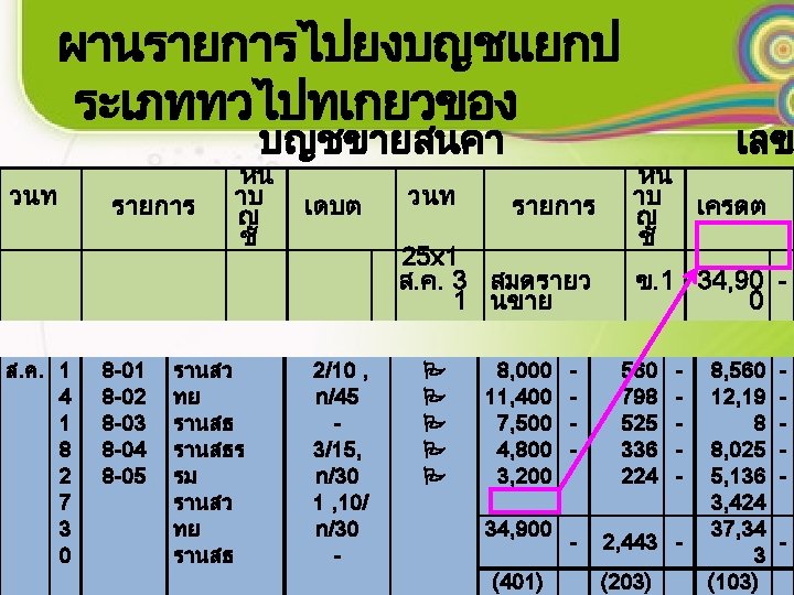 ผานรายการไปบญชแยกปร ะเภททวไป ภาษขาย Date Description Page No. Dr. Date Description amount 25 x 1 ส. ค. 31 สมดรายวน ขาย ส. ค. 1 4 1 8 2 7 3 0 8 -01 8 -02 8 -03 8 -04 8 -05 รานสว ทย รานสธร รม รานสว ทย รานสธ 2/10 , 8, 000 n/45 11, 400 7, 500 3/15, 4, 800 n/30 3, 200 1 , 10/ n/30 34, 900 Principles of Accounting II - Page No. Cr. amount ข. 1 2, 443 - 560 798 525 336 224 - 2, 443 - 8, 560 12, 19 8 8, 025 5, 136 3, 424 37, 34 28 3 - N