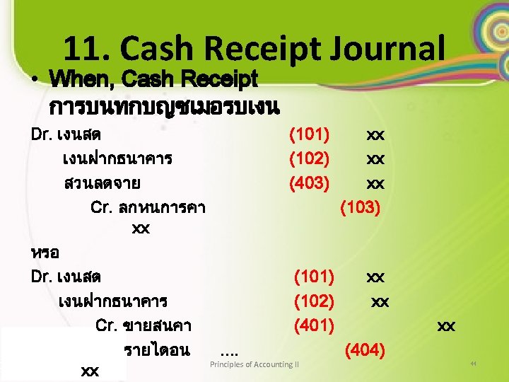 11. Cash Receipt Journal • When, Cash Receipt Dr. Cash (101) xx Cash in Bank (102) xx Sale Discounts (403) xx Cr. Accounts Receivable (103) or Dr. Cash (101) xx Cash in Bank (102) xx Cr. Sale (401) Other Revenues (404) Loan (204) Investment (105) Principles of Accounting II xx xx xx 43