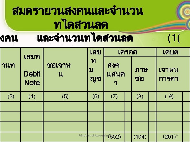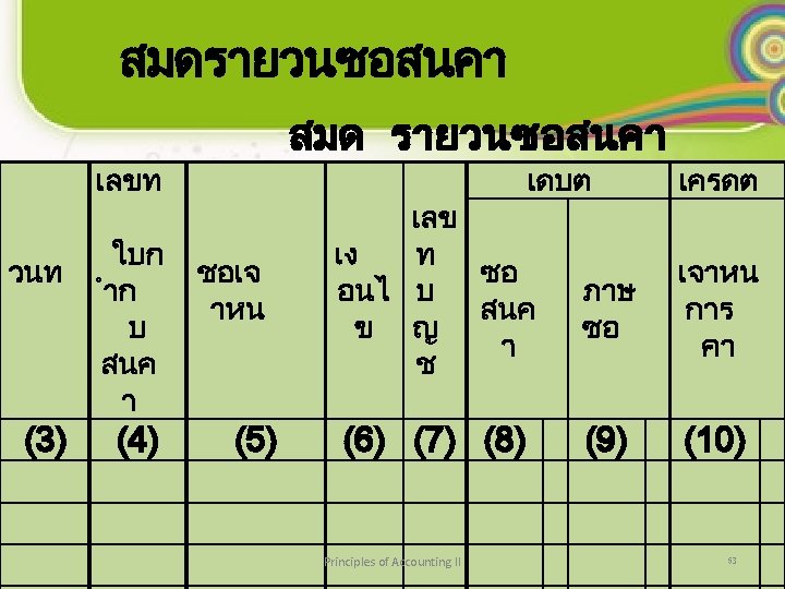 13. Purchases Journal • Recognition entry; Purchases on account การบนทกบญช : ซอสนคาเปนเงนเชอ Dr. ซอสนคา (501) xx ภาษซอ (104) xx Cr. เจาหนการคา (201) xx Principles of Accounting II 51