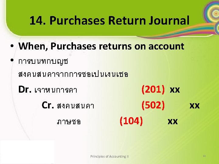 14. Purchases Return Journal • When, Purchases returns on account Dr. Accounts Payable (201) xx Cr. Purchases Returns (502) xx Vat of Purchases (104) xx Principles of Accounting II 63