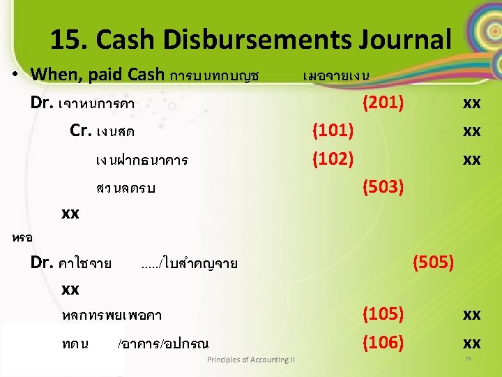 15. Cash Disbursements Journal • When, paid Cash Dr. Accounts Payable Cr. Cash in Bank Purchases Discounts (201) (101) (102) (503) xx (505) (106) (101) (102) xx xx xx Or Dr. Expense/Voucher Investment Fixed Assets Cr. Cash in Bank Principles of Accounting II xx xx 74
