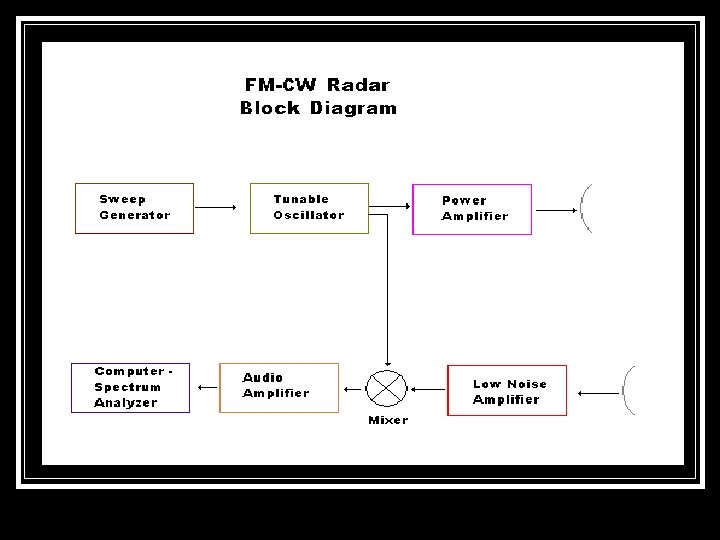 Operation of FM-CW Radars: The Receiver Picks up not only the reflected signal, but also signal from the transmitter a short distance away (e. g. 0. 75 meters). n The two oscillations are multiplied together in a non-linear device (mixer) to extract a beat note which contains range information. n Range information is calculated using Fourier Analysis. n