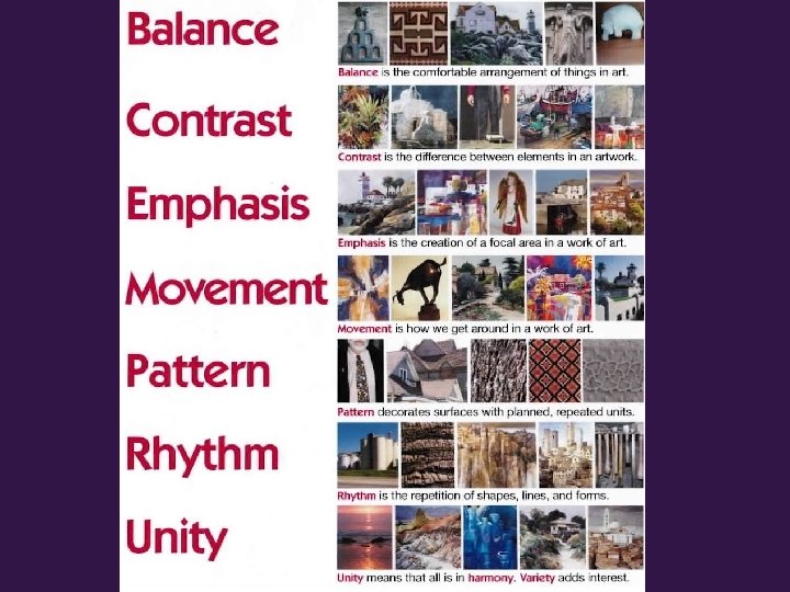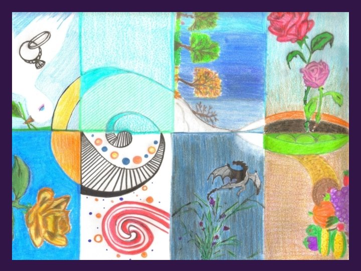 Principles Drawing Activity • Step 1: Take a sheet of computer paper and fold it EVENLY three times; unfold. You have 8 equal size boxes. • Step 2: Draw a faint line with a pencil that passes through all 8 boxes; make it curved or angular. • Step 3: Flip the page over and with a pencil faintly label each box with one of the 8 principles of art. Flip the page back over. • Step 4: Using the elements of art, create a visual example of each principle and illustrate it in the correctly labeled box.