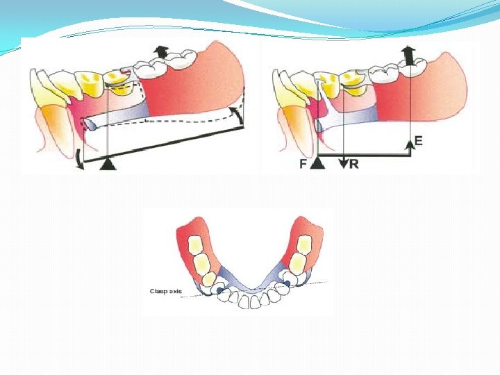 �Tooth shape influences retention by determining the depth and steepness of undercut available for clasping. Clasps 1 and 2 are positioned in the same amount of undercut and therefore provide the same overall retentive force. However, for the same small vertical displacement, clasp 1 is deflected more than clasp 2 and therefore offers greater initial resistance to the displacing forces. undercut area nearer to the saddle: ring clasp Tilted molar: ring clasp