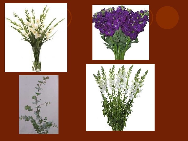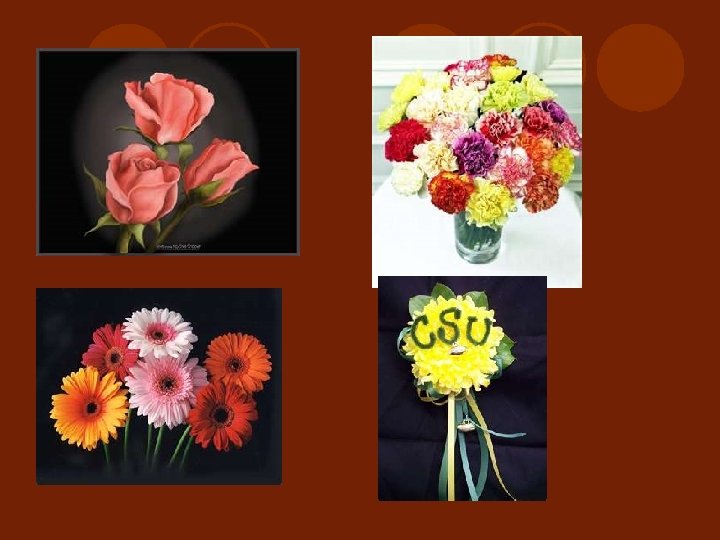 Mass flowers l Single stem flowers with large, rounded heads. l Also used when no line flowers are present to create outline of arrangement. l Sometimes used as the focal point or main flower of an arrangement.