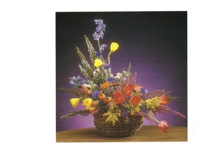 Filler flowers l Used to fill gaps between mass flowers. l Give depth to the arrangement. l Should compliment the mass and line flowers l They are bunchy or feathery (so ferns fall here). l Usually the most inexpensive part of the arrangement.