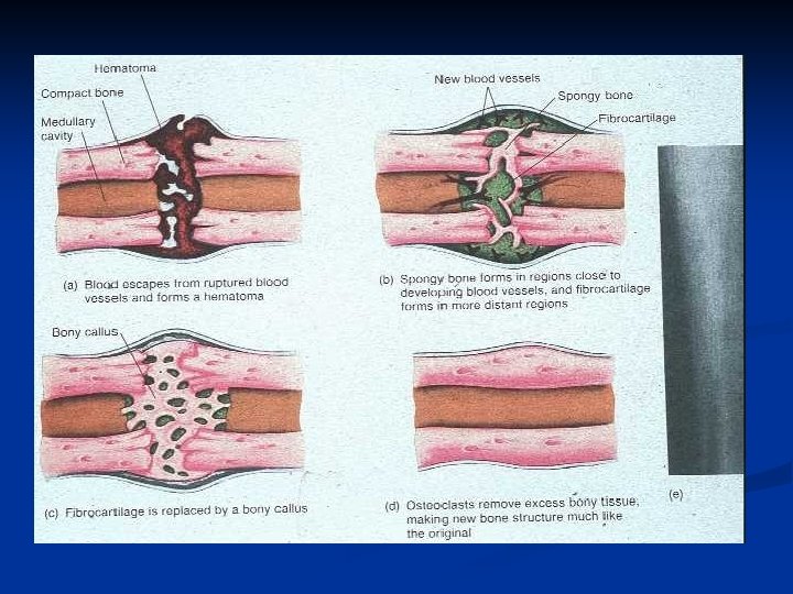 Five stages of healing: 1. 2. 3. 4. 5. tissue distraction and haematoma formation. inflammation and cellular proliferation {within 8 hours of fracture} which bridged the fracture and haematoma slowly absorbed. callus formation {the thick cellular mass with its island of immature bone and cartilage forms the callus or splint on the periosteal and endosteal surfaces. consolidation {osteoblastic and osteoclastic activity the woven bone transformed to lamellar bone. It may take several months. remodeling thicker lamellae are laid down where stresses are high unwanted buttresses are carved away, the medullary cavity is reformed. The bone especially in children reassume something like its normal shape.