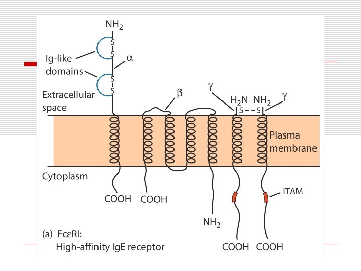 Mast Cell Receptors o Fc epsilon RI n n o Alpha chain n o Two Ig like domains; extracellular Gamma chain n n o Ig superfamily Alpha, beta and gamma chains Homodimer; two intracytoplasmic tails ITAMs Cross linkages activates PTKs n Cell signaling leads to degranulation