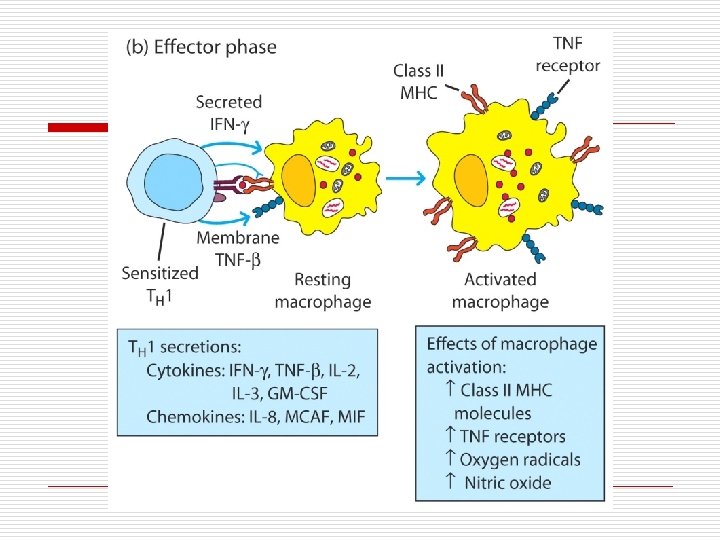 Type IV Hypersensitivity o T cell mediated n n n T helper 1 cells Effector response is through macrophages not T cytotoxic cells Cytokine mediated o o IL 3 Hematopoiesis Interferon, TNF, IL 1 Extravasation MCAF Attracts macrophages MIF Retains macrophages