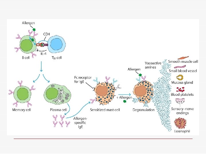 Type I Hypersensitivity o Mechanism n n n Allergen is recognized by naïve B cell stimulated by T helper cell through IL 4 Ig. E specific for allergen is recognized by mast cell Cross linkage of Ig. E on mast cells Mast cell degranulates