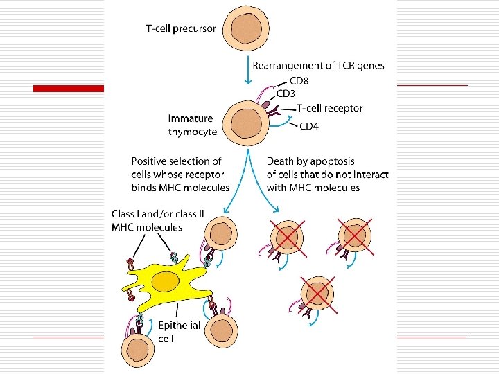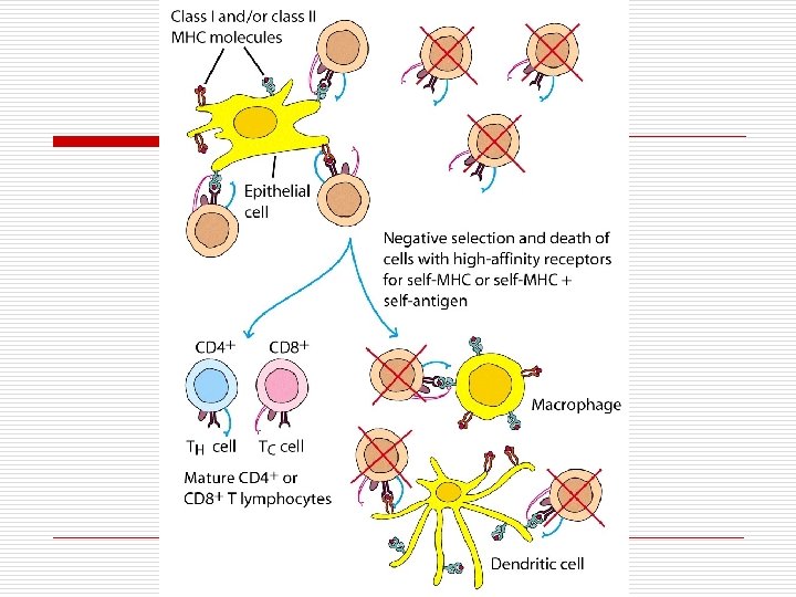 Thymic Selection o Negative selection n CD 4 or CD 8 cells that survive positive selection may react or bind to self MHC alone with high affinity or with Self MHCself Ag complexes These cells are programmed to die Nonbinders survive