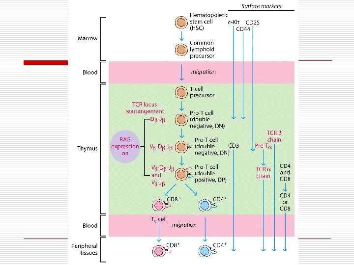 Thymocyte Changes o Double negative cells n n n No expression of CD 4 or CD 8 Rearrangement of TCR beta genes (V, D, J) Loss of stem cell markers (c-Kit, CD 44) Expression of Pre TCR (Beta chain plus pre alpha chain) Suppression of further beta chain changes Signal to initiate alpha chain