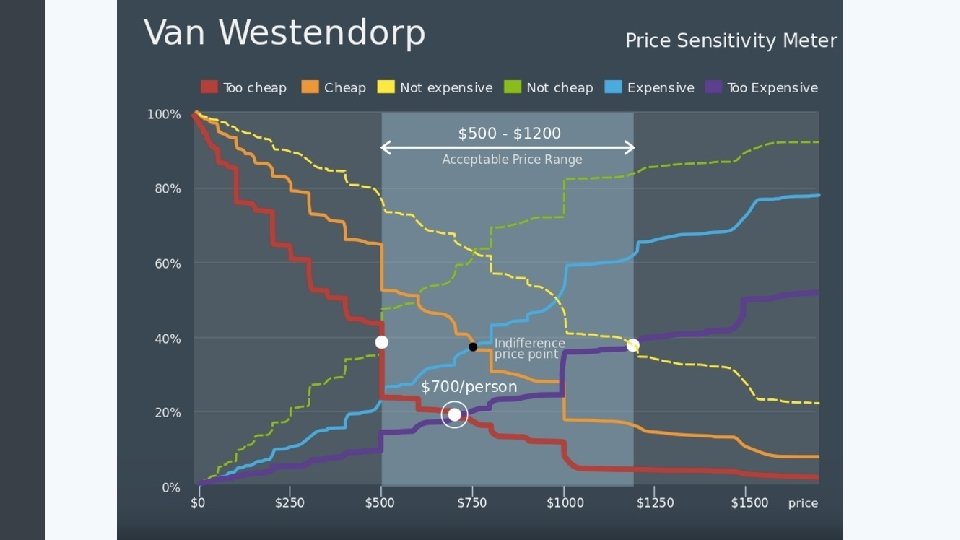 Van Westendorp Price Sensitivity Questions 1. At what price would you consider the product to be so expensive that you would not consider buying it? (Too expensive) 2. At what price would you consider the product to be priced so low that you would feel the quality couldn’t be very good? (Too cheap) 3. At what price would you consider the product starting to get expensive, such that it’s not out of the question, but you would have to give some thought to buying it? (Expensive/High Side) 4. At what price would you consider the product to be a bargain—a great buy for the money? (Cheap/Good Value)