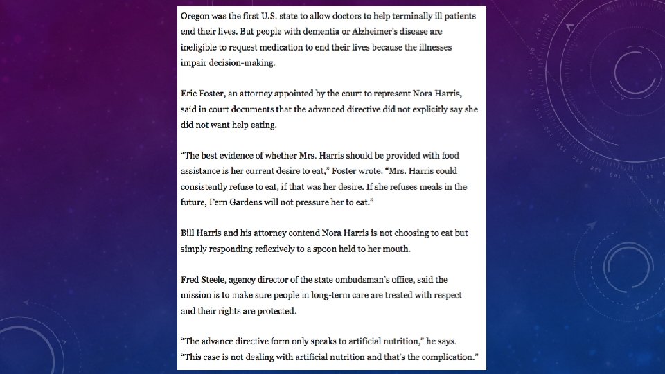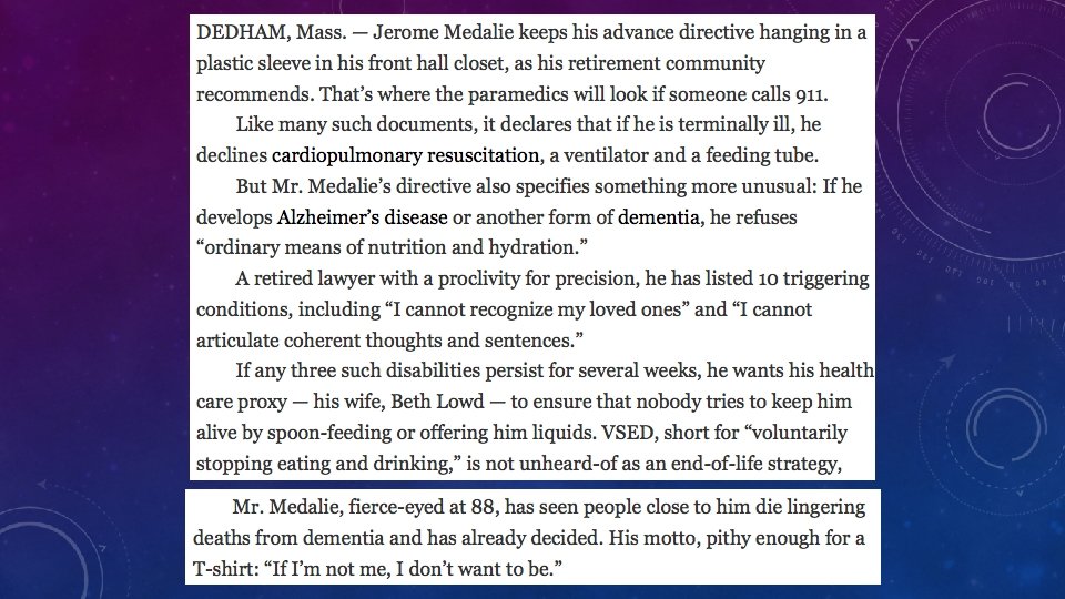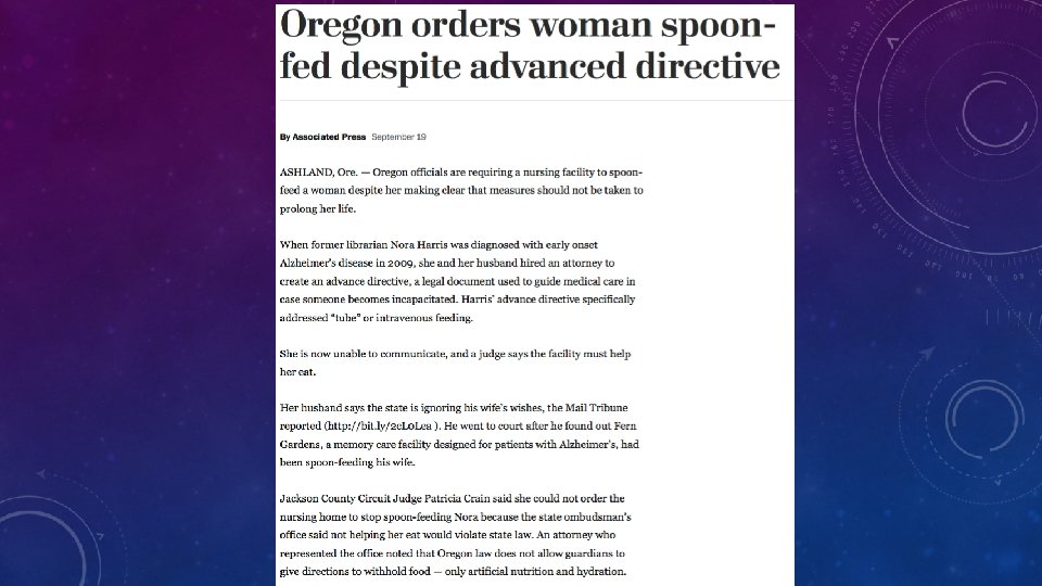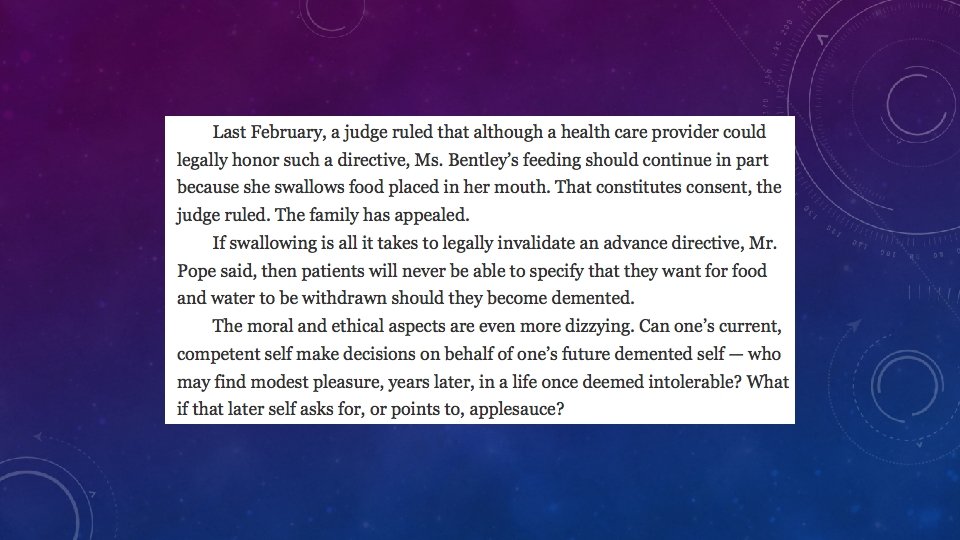 • Advanced Directives • Go into effect if physician determines that pt lacks the ability (capacity) to make own health care decisions • Living Will – written request to forgo certain treatments in the event of a TERMINAL or IRREVERSABLE condition. • Medical determination must be made that you have no reasonable possibility of regaining consciousness or decision-making capability • Does not apply if you are able or will be able to speak for yourself • Does not give permission for physician to withdraw nutrition or hydration if you are permanently unconscious unless indicated on living will • Durable Power of Attorney for Health Care – document that appoints another person to be the health care agent • This person makes any necessary health care decisions for you