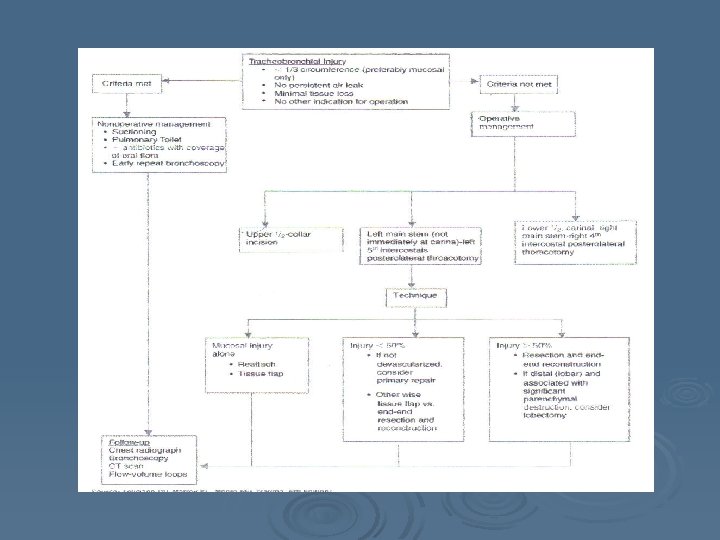 Operative Management Ø Airway Management l Single lumen ETT (long) • May be passed distal to injury l Proximal Injuries • May be passed into contralateral bronchus l l Distal Injuries Double lumen ETT • Allow for one lung ventilation • Larger size l l Cardiopulmonary Bypass High Frequency Jet Ventilation • Low airway pressures l ECMO