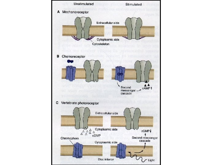WHEN DO CELLS PRODUCE ACTION POTENTIALS? 1 -- electrical stimulation (artificial depolarization) 2 -- spatial and temporal integration of EPSPs and IPSPs across the neurone’s membrane resulting in the neuronal threshold being reached. • Generator potential 3 -- sensory stimulation (transduction) • mechanical (cytoskeleton) • chemical (receptors, second messengers) • light (hyperpolarization)