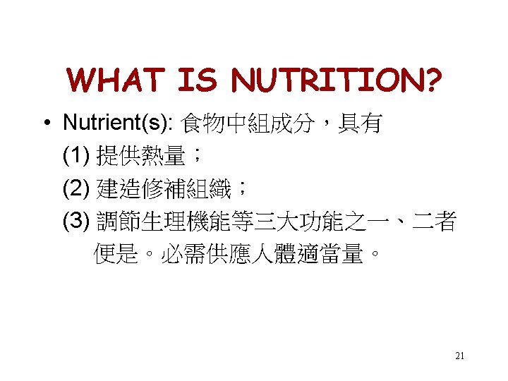NUTRITION “Is the science of foods, the nutrients & other substances therein; their action, interaction, & balance in relationship to health & disease; the processes by the organism ingests, digests, absorbs, transports, & utilizes nutrients & disposes of their products. In addition, nutrition must be concerned with social, economic, cultural, & psychological implications of food & eating. ” 20