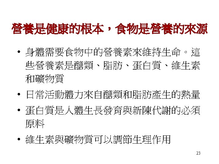 The Nutrients 1) Macro (巨量) nutrients: Protein, Fat, CHO 2) Micro (微量) nutrients: Vitamins, Minerals 3) Essential (必需) nutrients: 身體不可或缺的物質,但人體本身不 能產生或量不足者,需由食物來供應 22