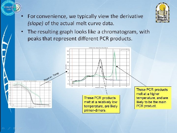 l l l Melt curves can tell us what products are in a reaction. PCR products that are shorter will melt at lower temperatures. Different PCR products will therefore have different shaped curves. 3’ 5’ ID ID 5’ 3’