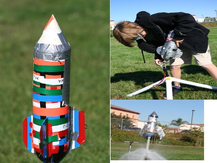 Our Water Rockets n. Instead of hot gasses creating pressure, we use a bike pump and store pressure Action: Expelling water from engine bottle. (water is forced down) Reaction: Water resisting against rocket body. (Rocket is forced up)