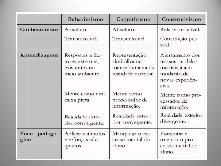Cognitivismo Construtivismo • os processos mentais que estão por detrás do comportamento • uma das correntes teóricas empenhadas em explicar como a inteligência humana se desenvolve partindo do princípio de que o desenvolvimento da inteligência é determinado pelas ações mútuas entre o indivíduo e o meio.