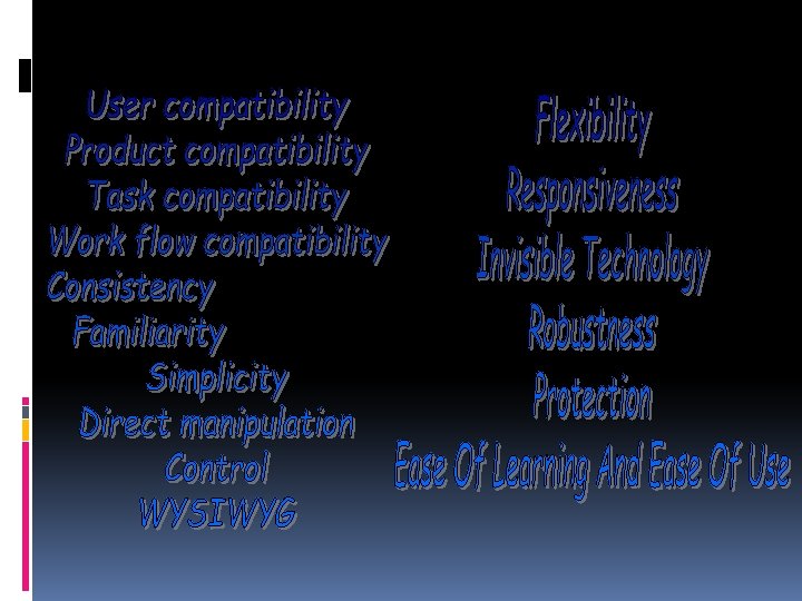Flexibility • Fleksibel merupakan bentuk dari solusi pada saat menyelesaikan masalah. • Software engineer dapat membuat berbagai solusi penyelesaian untuk satu masalah. • Sebagai contoh adanya menu, hotkey, atau model dialog yang lainnya. Responsiveness • Setelah memberikan inputan atau memasukkan data ke aplikasi system melalui antarmuka, sebaiknya sistem langsung memberi tanggapan/respon dari hasil data yang diinputkan. • Selain teknologi komputer semakin maju sesuai dengan tuntutan kebutuhan manusia, software yang dibangun pun harus mempunyai reaksi tanggap yang cepat. Hal ini didasari pada sifat manusia yang semakin dinamis / tidak mau menunggu.