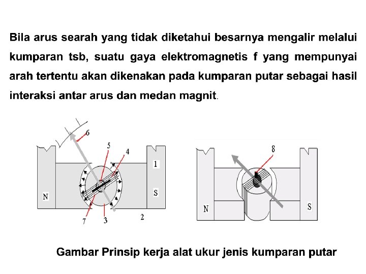 Alat Ukur Kumparan Putar • Pemakaian alat ukur kumparan putar sangat luas, seperti di laboratorium dan pada pusat pembangkit tenaga listrik. • Pada gambar berikut diperlihatkan adanya magnet permanen (1), yang mempunyai kutub-kutub (2), dan diantara kutub 2 utara dan selatan tersebut ditempatkan suatu silinder inti besi (3). • Pada celah udara antara kutub magnet dan silinder inti besi akan terbentuk medan magnet yang rata, yang masuk melalui kutub-kutub ke dalam silinder, secara radial sesuai dengan arah-arah panah. Di dalam celah udara ditempatkan kumparan putar (4), yang dapat berputar melalui sumbu (8).