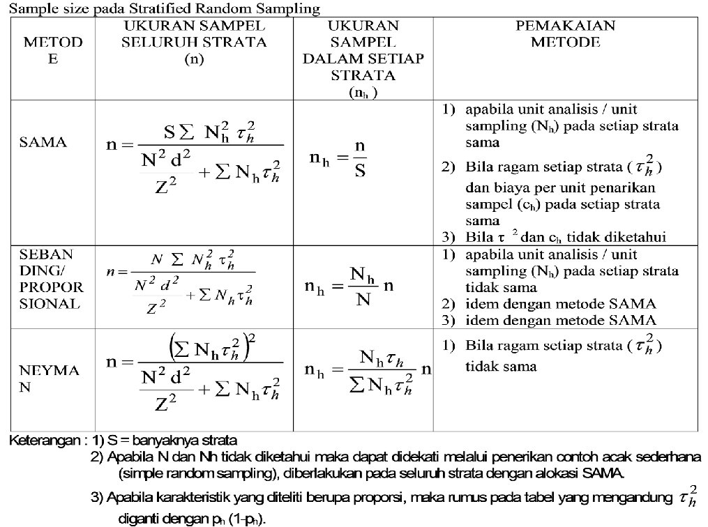TEKNIK SAMPLING 1. Keterwakilan (representatifness) Bilamana populasinya homogen, maka teknik sampling yang cocok digunakan adalah Simple Sampling Bilamana keadaan populasi heterogen, maka diupayakan dibuat strata-strata, yang mana di dalam masing-masing strata kondisinya seragam. Jika hal ini dapat dilakukan, maka sampel dapat diambil secara acak dari masing-masing strata Teknik sampling yang digunakan Stratified Sampling. Apabila keadaan populasi heterogen, yang mana heterogenitasnya merata dan membentuk gerombol, dimana karakteristik masing-masing gerombol dapat menggambarkan keadaan populasi, maka teknik sampling yang dignakan cluster sampling.