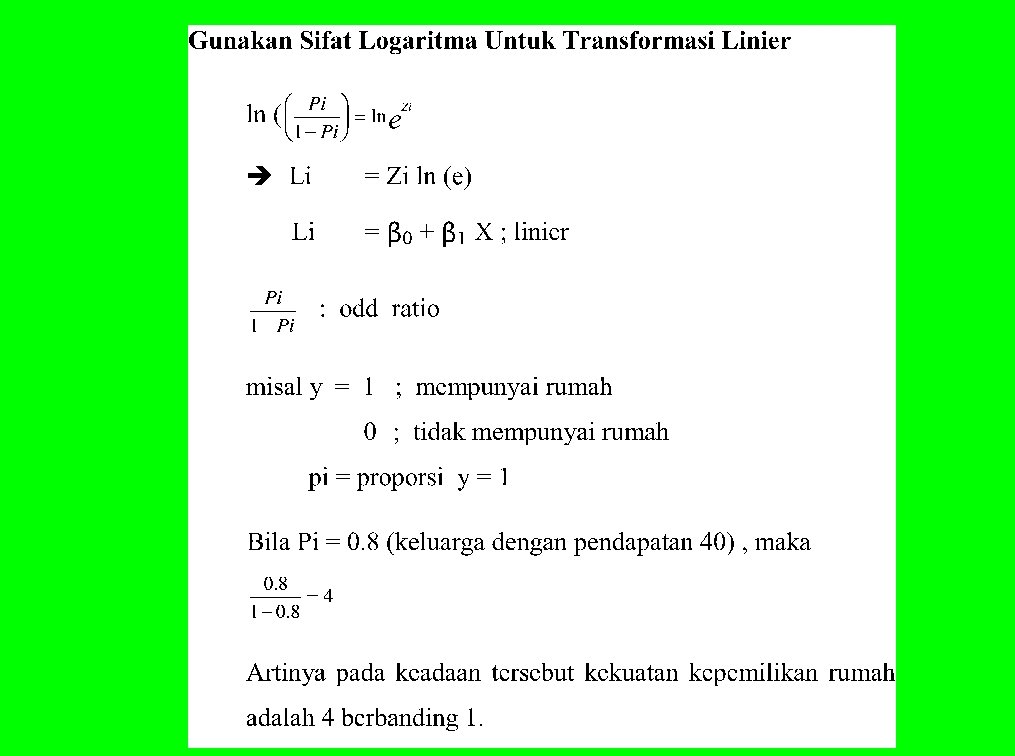 REGRESI LOGISTIK KEGUNAAN - Penjelasan (explanation) terhadap fenomena yang dipelajari atau permasalahan yang diteliti. Prediksi odd ratio suatu kejadian berdasarkan kondisi atau pertambahan nilai variabel bebas. - Faktor determinan, yaitu penentuan variabel bebas mana (pada regresi berganda) yang berpengaruh dominan terhadap variabel tergantung. Hal ini dapat dilakukan bilamana unit satuan data seluruh variabel sama, skalanya homogen dan bersifat kontinyu. - Catatan: Kategori variabel dependen bersifat biner atau multi