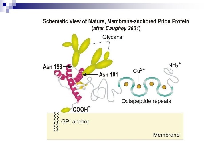 Prion protein n n n n Branched-chain Carbohydrate (attached to Asn residues) Normal host protein Expression enriched in CNS Expression is regulated during development GPI linked glycoprotein Disulphide bridge Enriched in lipid rafts linking two internal (detergent-resistant cystine residues membrane islands) Highly conserved (throughout mammals & perhaps amphibians) 3 alpha helices 2 stranded anti-parallel beta sheet