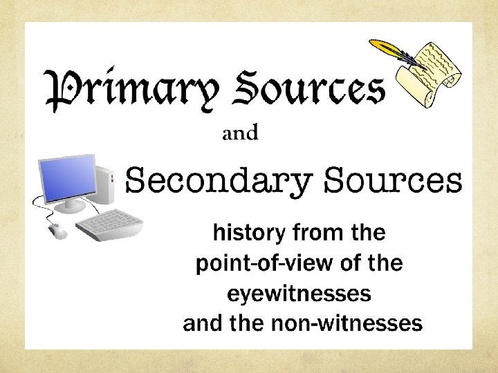 Summative Assessment Have YOU mastered the Learning Target? Our Learning Target: Students will be able to identify the difference between primary and secondary sources. On a ½ sheet of lined paper, state your full name, date, and class period in a proper heading then number your paper #1 -10 in a list. Determine if the following slides are discussing a primary or a secondary source and write either Primary OR Secondary. Good Luck!