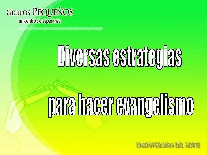 Actividades de Crecimiento a través de los grupos pequeños Interno Externo 1. ACTIVIDADES SOCIALES 2. ACTIVIDADES ESPIRITUALES - Semana Santa - Semana del Hogar - Cultivo de intereses - Semana de mayordomía 3. ACTIVIDAD DE RECOLECCIÓN 1. ACTIVIDADES EVANGELÍSTICAS - Actividades sociales - Campaña de evangelismo - Levantando la cosecha - Nuevos lugares y nuevas iglesias