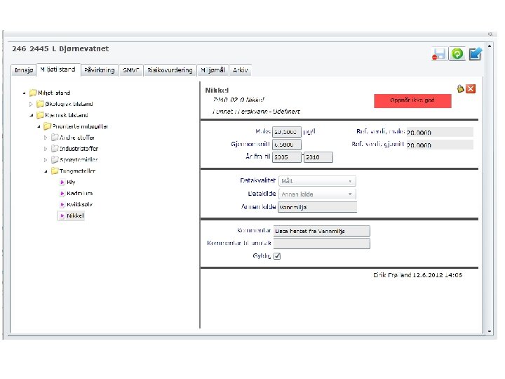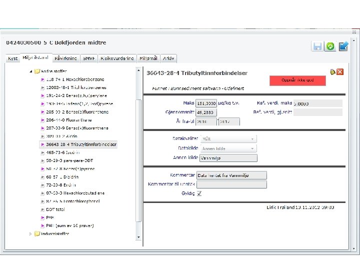 Example of delineation based on sediment values: Note: These are Cu-levels, hence relevant for classification of ecological status. Principle of delineation is the same for pri-subst.