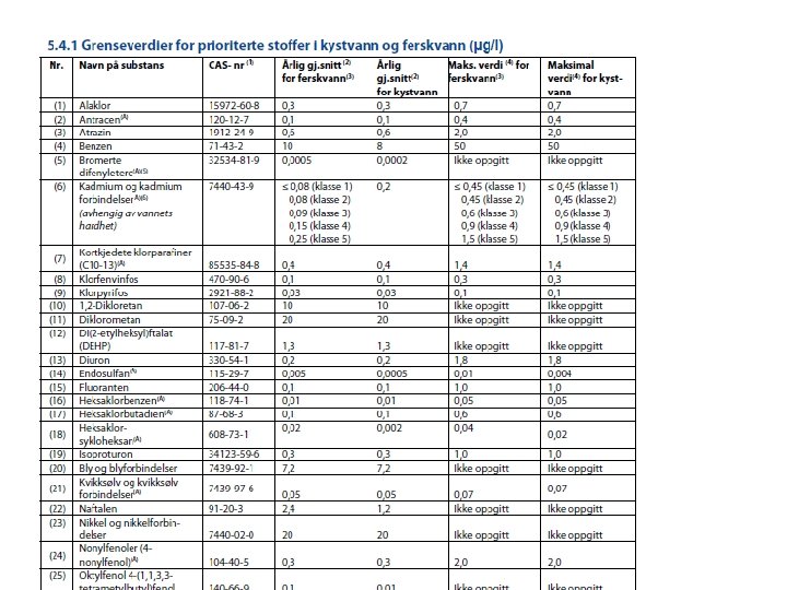 While waiting for EQS: • Norway are using limit values in freshwater and coastal water for – yearly mean value • defined for 33 of 33 – maximum value • defined for 18 of 33