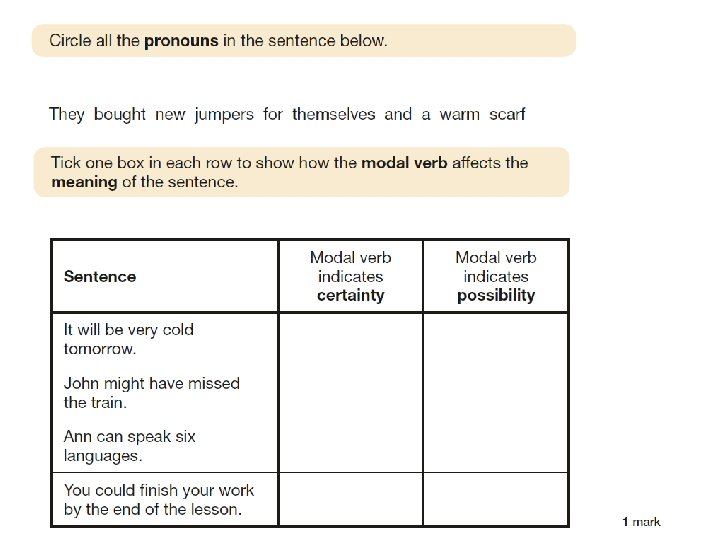 Grammar and Punctuation Changes to the Grammar, Punctuation and Spelling Test: • There is a greater focus on knowing and applying grammatical terminology with the full range of punctuation tested. • Technical terms in grammar will be tested. • There will be one test paper for grammar, punctuation and vocabulary and one test paper for spelling. The design of the tests is unchanged. • The grammar test will last for one hour and there will be a total of 50 marks available. • In the grammar test, two thirds of the marks will be for multiple choice questions. The remaining questions will require pupils to write a longer answer.