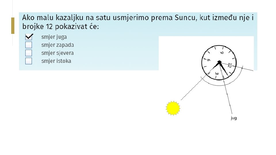 Mala kazaljka na ručnom satu je okrenuta prema Suncu. Koja strana svijeta je između male kazaljke i brojke 12? Jug Uz pomoć crteža ručnog sata označi četiri glavne strane svijeta prema položaju Sunca! jug zapad istok sjever