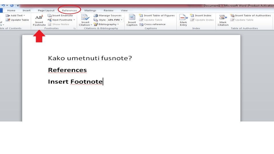 Što i kako citirati? Postoje dva mjesta na kojima citiramo: - u tekstu (u zagradama ili u pozivnim bilješkama, tj. fusnotama. - na kraju rada (u popisu literature, tj. bibliografiji) Citat mora obuhvaćati sljedeće podatke: Tko je autor izvora Naslov Gdje je izvor objavljen, i to Za knjigu: izdavač i mjesto izdanja Za članak: koji časopis, godište, broj, stranice od-do Godina objavljivanja