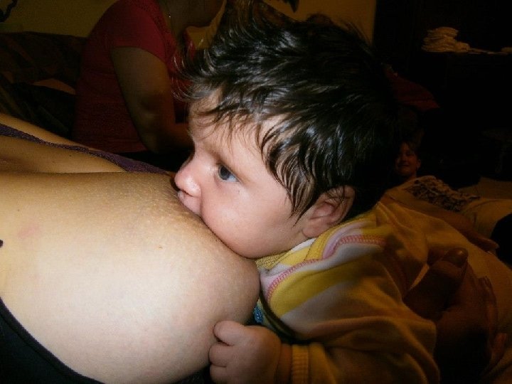 O polohe s prirodzenou gravitáciou • • • Sú to vlastne všetky polohy, kde je bábätko bruškom na brucho, hlava je vyššie ako bruško a nožičky sa môžu zapierať o podložku alebo o mamičku Dieťa pri nich pije vo vertikálnej polohe, teda tak, ako jeme a pijeme aj my dospelí Mnohokrát ich používame – pri kontakte pokožka na pokožku, pri nosení, pri futbalovej polohe. . . Aj pri tejto polohe je dôležité asymetrické prisatie – pomáha pri ňom gravitácia, ale tiež ho treba mať pod kontrolou video: http: //www. mamila. sk/pre-matky/nazorne-ukazky-spravneho-dojcenia/video-odojceni-8/. Môžte si všimnúť, že matka nemusí robiť skoro nič, pohodlne sedí a pritom sa dieťa prisaje samé, s pekným asymetrickým prisatím – hlava pekne vyvrátená. Dieťatku ruky nezavadzajú, ale plnia svoj účel, je pekne bruško na bruško, nôžky sa zapierajú o podložku. Dá sa dosť jednoducho popísať i na diaľku, matka to zvládne zopakovať po zhliadnutí bez zvláštnej pomoci Môžte porovnať s priečnou polohou http: //www. mamila. sk/pre-matky/nazorne-ukazky -spravneho-dojcenia/video-o-dojceni-7/, kde mamička musí vynaložiť viac úsilia, aby bola dobrá asymetrická poloha. Dieťe síce dobre pije, ale padá mu hlavička nabok (mamička by mala hlávku viac podopierať), zavadzajú mu rúčky, bruško nie je na brušku a nôžky si nemá kde zapierať.