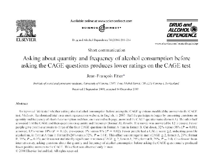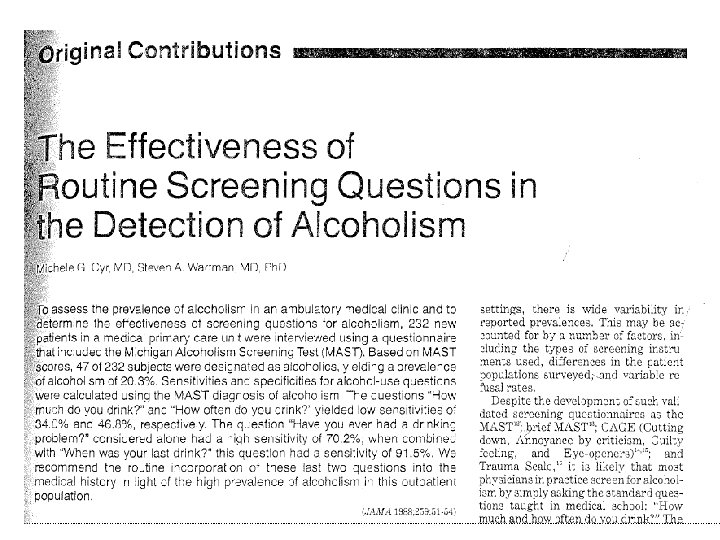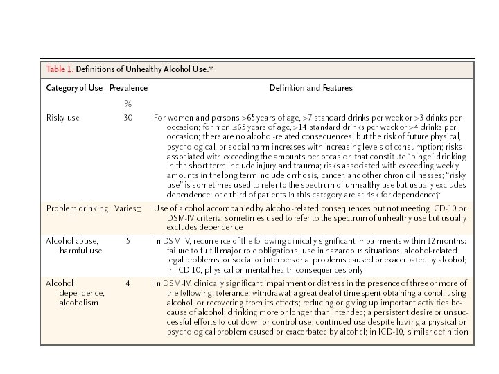 Dépistage • Marqueurs biologiques CDT sensibilité 39 -94% GGT VGM 34 -84% 15 -69% Spécificité 82 -100% 11 -85% 26 -91% ½ vie 14 -17 j 2 -3 sem 3 mois ÞLes marqueurs ne détectent pas le risque de sevrage! ÞSi 2 marqueurs positifs: prévention