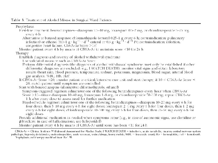 Diagnostique • CIWA-Ar score Mild: < 15 Moderate: 16 – 25 Severe: > 20