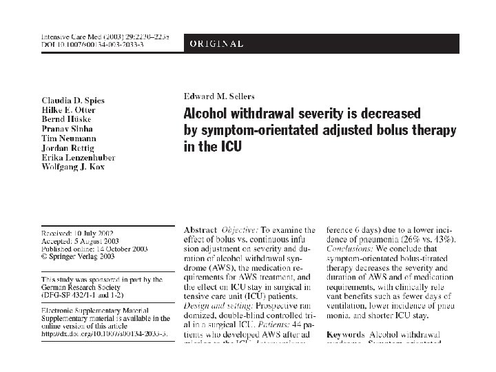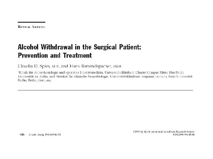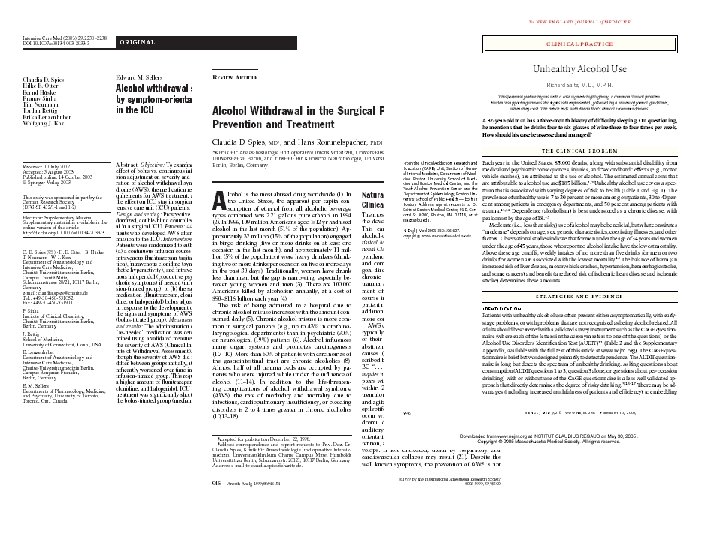 JAMA Journal of the American Medical Association Pharmacological Management of Alcohol Withdrawal: A Meta-analysis and Evidence. Based Practice Guideline Volume 278(2), 9 July 1997, pp 144 -151