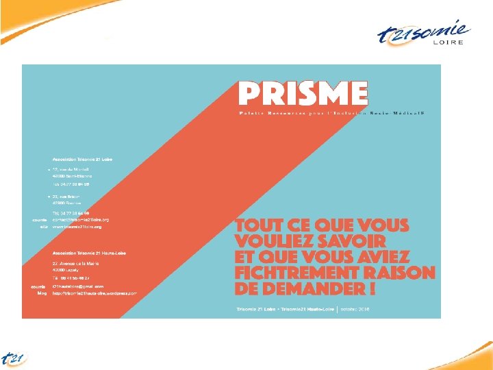 PRISME Palette Ressource pour l’Inclusion Medico Social. E « Le dispositif PRISME, issu d’une expérimentation mise en œuvre par l’association GEIST 21 -Trisomie 21 Mayenne, a été élaboré au cours des années 2013 -2015 et sa mise en œuvre effective dans la Loire a été enclenchée en septembre 2015. »